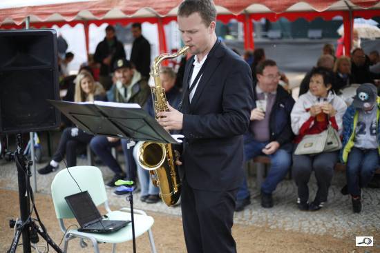 Velká světelnost do třetice – saxofonista a publikum v pozadí. Saxofonista ostrý, publikum v pozadí je čitelné. Skvrnky na fotce, to jsou kapky deště… málo platné, je to 1/1250 vteřiny. Miluji vysokou světelnost právě pro tuto její vlastnost.
