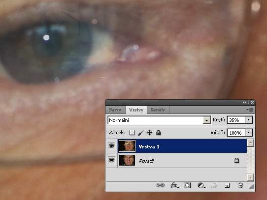 Není třeba moc dbát na stabilitu, i já jsem se trochu hnul. Při spojování vrstev (nahoru umístíme fotku s brýlemi, do spodní vrstvy, respektive jako pozadí, dáme fotku bez brýlí) snížíme krytí a nástrojem Přesun (klávesa V) horní oči napasujeme na ty spodní.