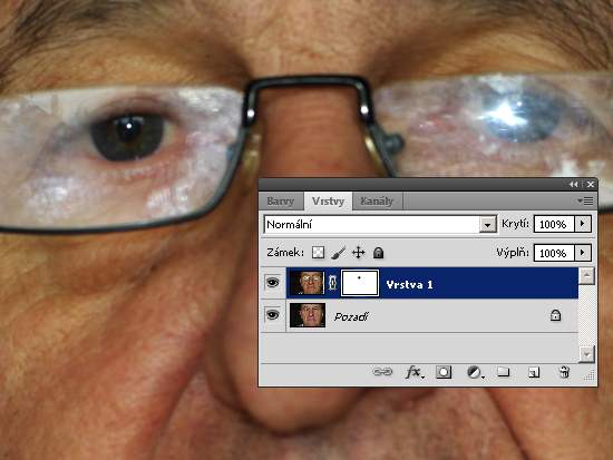 Je třeba postupovat uvážlivě, aby to nevypadalo, že ten člověk má na nose prázdné obroučky. Trochu lesku je dobře tam nechat, ale oči, duhovka a zřítelnice, ty by měly být patrné. No a výsledek je zde: