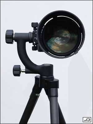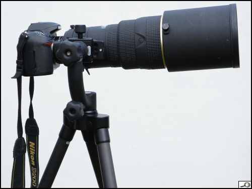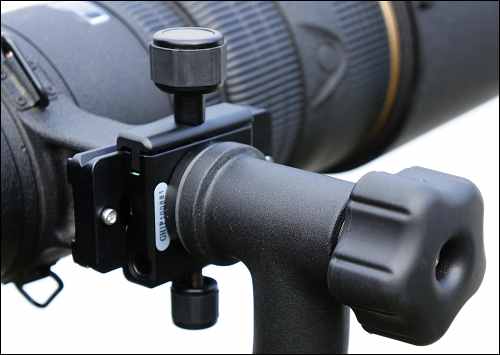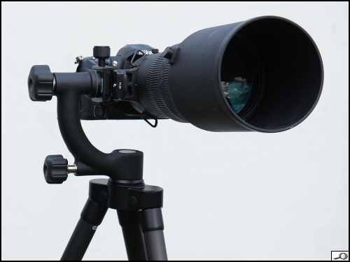 Na snímku je Nikon D200 a nikonská třístovka F 2.8. Ke stativu (jde o karbonový stativ Benro C2190T, který jsem tu v recenzi velebil za výborný poměr cena / výkon) se hlava připevní běžným šroubem, snadno ji vyměníte za stávající hlavu (já měl kulovou hlavu Benro B1). Na fotce vidíte, že se objektiv k hlavě připevní z boku k patce se stativovým šroubem na otočném prstenci na objektivu. Ten je samozřejmě podmínkou, ovšem všechny opravdu výkonné teleobjektivy takový prstenec mají. Aby bylo jasno, toto je nikonský objektiv 70-200 s onou patkou na otočném prstenci, zajišťuje se šroubem, který vidíte nad patkou.