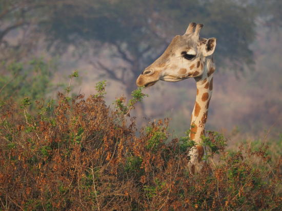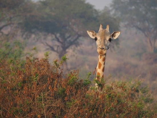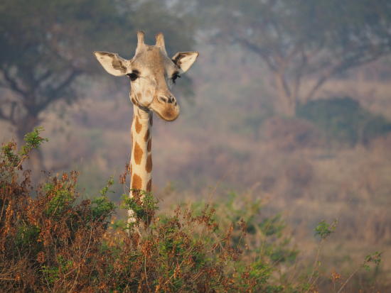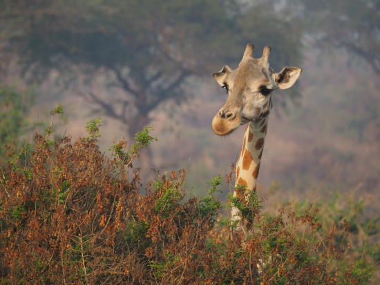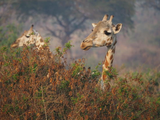 Tahle byla ta první. Bylo nýádherné ranní slunce a žirafa legračně čučela zpoza křoví.