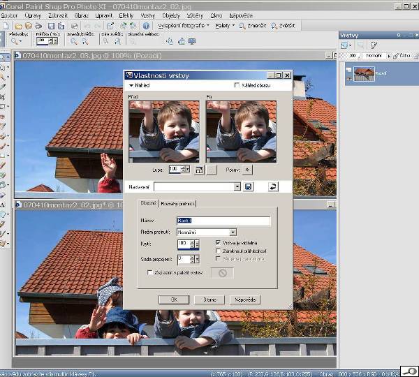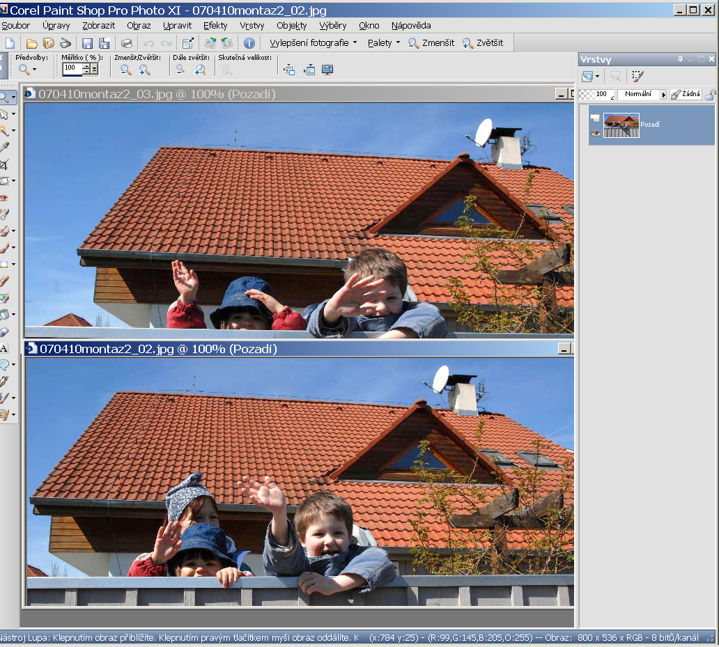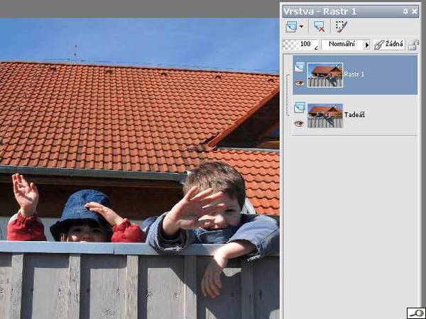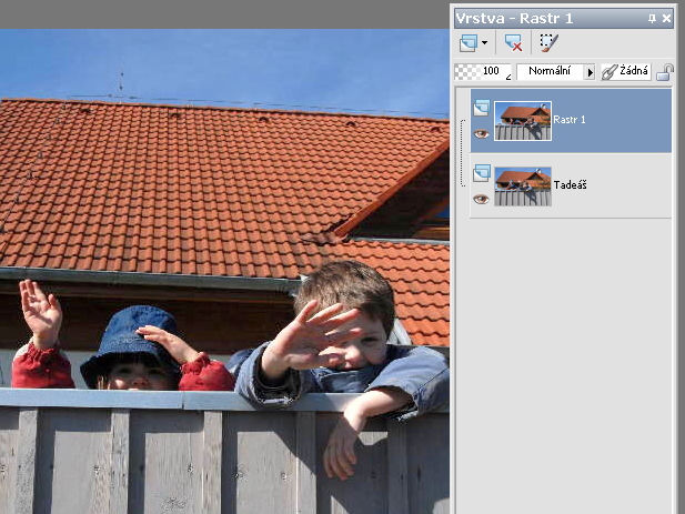 Nejdříve si otevřeme paletu Vrstvy (palety->vrstvy nebo klávesa F8) a zvolíme si jeden z obrázků, které chceme smontovat. Vybral jsem dva, na jednom je dobře holčička, na druhém chlapeček. Na naší ukázce je aktivní spodní obrázek s mávajícím chlapečkem. V paletě Vrstvy je jediný obrázek – miniatura a vedle něho je označení Pozadí.
