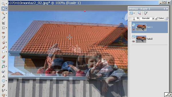 A teď je to trochu náročnější na představivost. Přejdeme k druhému obrázku, klepneme na něj – a ani si nemusíme všimnout, že se změnil obsah palety Vrstvy: ten je vázán na aktuálně aktivní obrázek a ten jsme změnili, takže na to pozor! My nyní chceme přenést obsah druhého obrázku jako vrstvu to prvního obrázku. Uděláme to volbou Ctrl+A (známý příkaz “vyber vše”, společný snad všem woknovým editorům obrazu i textu, které znám). Tím zkopírujeme obsah obrázku do schránky. A teď pozor: musíme se vrátit do původního obrázku (ve kterém jsme si už převedli “pozadí” na vrstvu s názvem Tadeáš) a sem vložíme ze schránky obsah druhého obrázku. Ale pozor: kdybychom použili běžného příkazu Ctrl+V , otevřeli bychom obsah schránky jako samostatný nový obrázek. Musíme tedy buď jít do menu a volit Úpravy->vložit jako novou vrstvu, anebo použít klávesovou zkratku Ctrl+L. To písmeno označuje “layer”, tedy vrstvu.