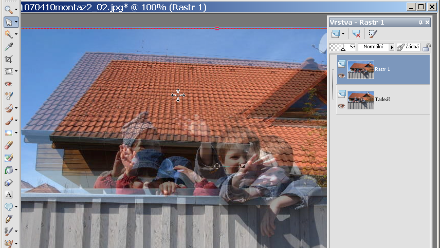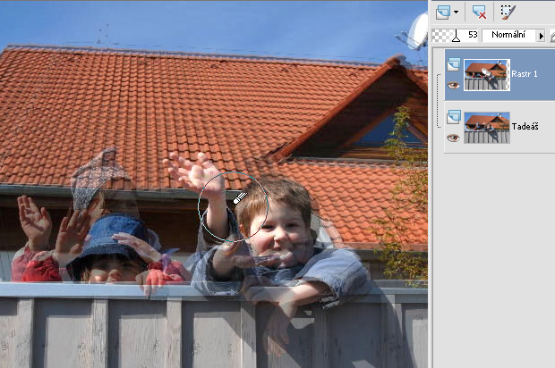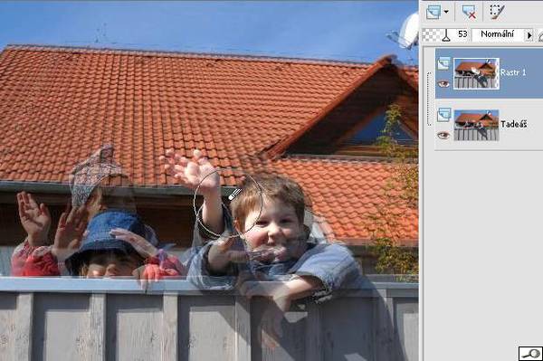 Postupujeme tak, že nejdříve jedné vrstvě – třebas té horní, je to vcelku jedno, nastavíme krytí na nějakou nižší hodnotu – já to udělal na 53. Tím vrstva do značné míry zprůhledněla. Pak z palety nástrojů vlevo volím nástroj Výběr objektu (tlustá šipka, druhý nástroj shoda, lze použít i jednoduchou klávesu K. Kurzor se změní ve známou čtyřsměrnou šipku a jím nastavíme obě vrstvy tak, aby se kryly. Pro použití v jiných případech podotknu, že v režimu nástroje Výběr objektu lze výběr (celý obrázek nebo i jenom jeho část) natáčet a měnit mu velikost. To v našem příkladu dělat nebudeme. Obrázek nejdříve spasujeme a pak přejdeme na nástroj Guma (klávesa X), jímž se “promažeme” do spodní vrstvy. Je to vidět na našem příkladu:
