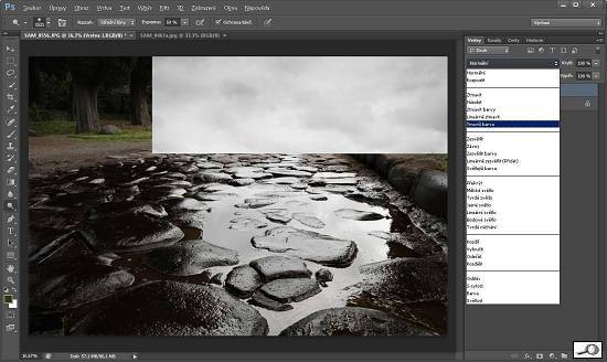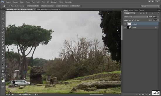 Zbývá poslední operace. Zvolíme jako způsob prolnutí Tmavší barva. To znamená, že obloha (je tmavší) se prokopíruje na bílou plochu původního obrázku (na světlejší), ale nikoli na koruny pinií a do větviček křovin.