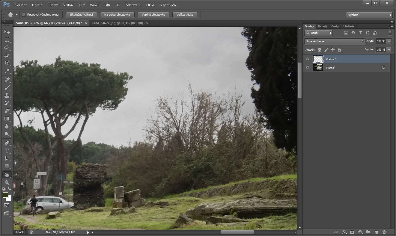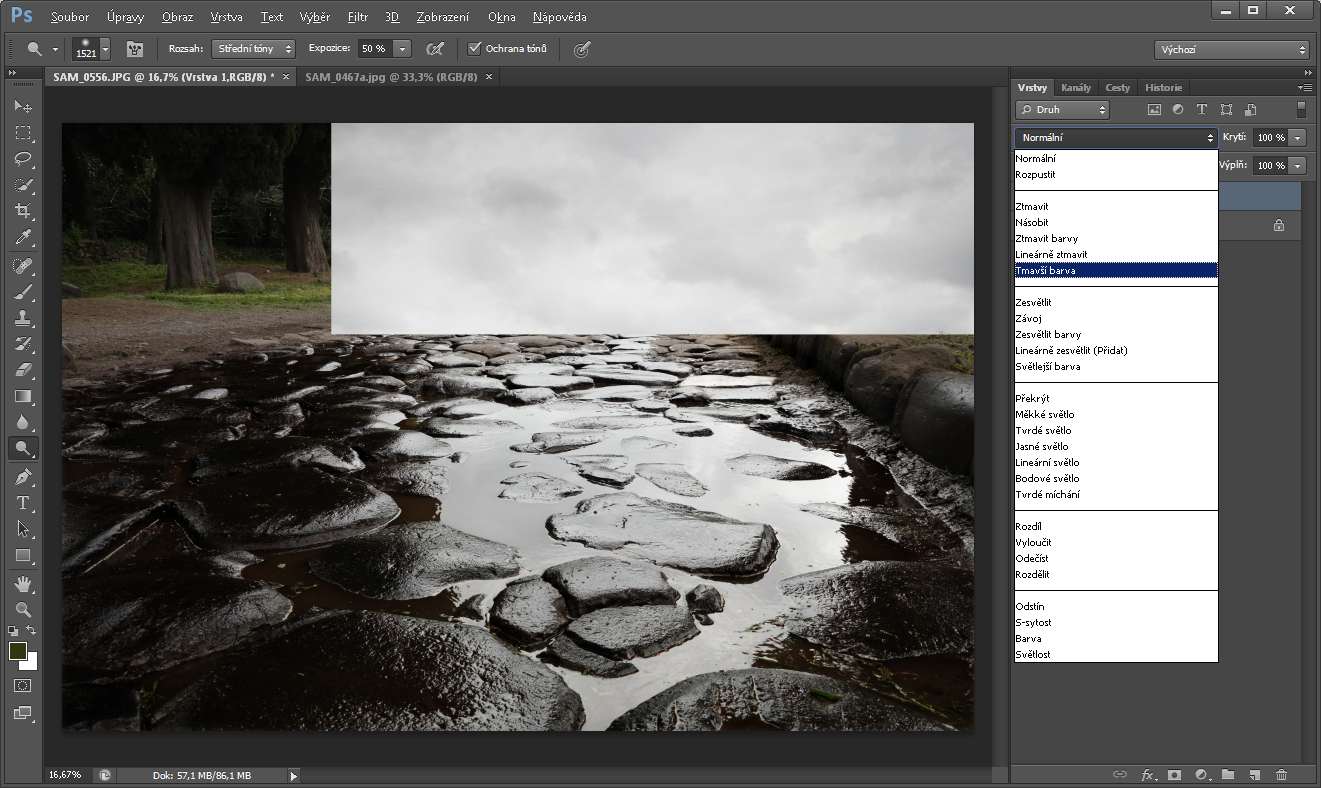 Zbývá poslední operace. Zvolíme jako způsob prolnutí Tmavší barva. To znamená, že obloha (je tmavší) se prokopíruje na bílou plochu původního obrázku (na světlejší), ale nikoli na koruny pinií a do větviček křovin.