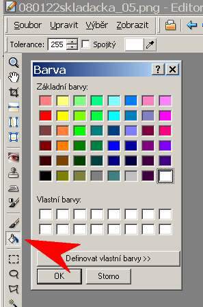 klávesou G. Je třeba zvolit barvu a toleranci. Barva je snad jasná – poklepáním na barevný obdélníček na liště (vedle kapátka) se otevře barevnice, zde volíme buď ze základních barev v nabídce, anebo si můžeme definovat vlastní barvy.