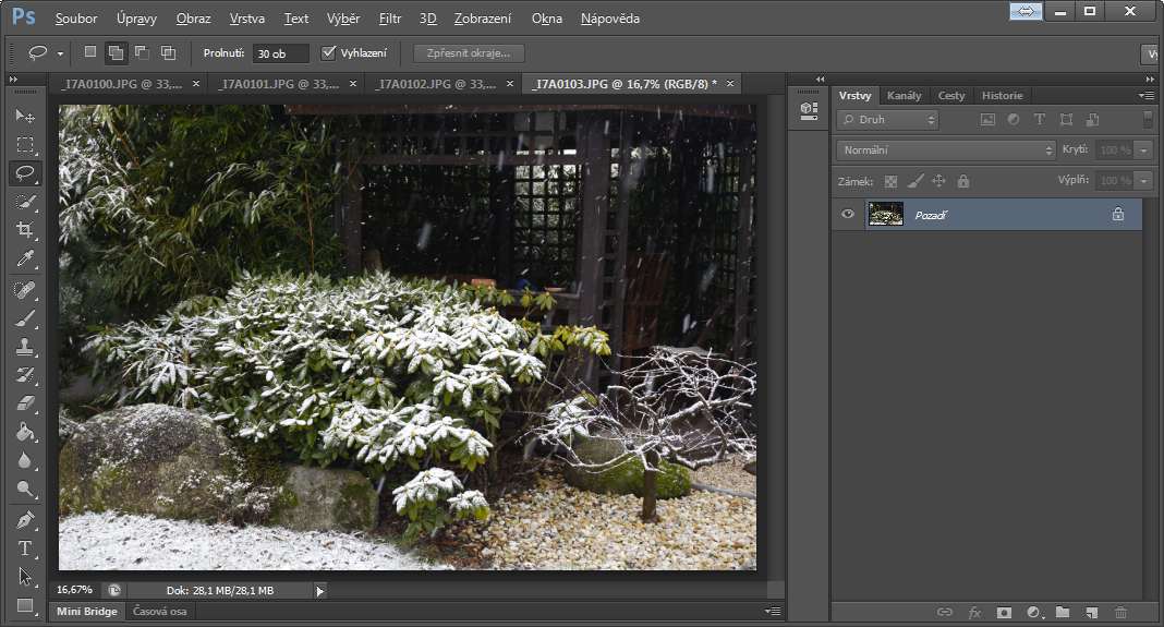 Jde o to, abychom do jedné fotky zkopírovali více vloček. Pořídíme tedy sérii fotek a prokopírujeme je dohromady – sečteme všechny vločky, co jich tam napadalo. Byla by to šílená práce, kdybychom nějakým nástrojem výběru – dejme tomu kouzelnou hůlkou – vybírali vločky a přenášeli je z jedné fotky na druhou. PS a PS Elements to umožňují celkem jednoduše, metodou prolnutí vrstev.