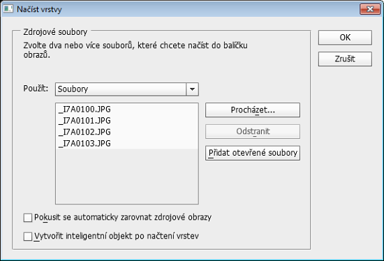 Toto je dialog tohoto příkazu. Volíme Přidat otevřené soubory – a ony se natáhnout do okna Použít Soubory , pokud jsou uložené. Když na to zapomenete, PS vám to připomene.