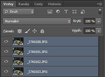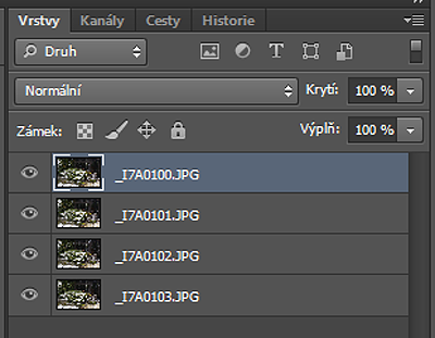 V okně Vrstvy to pak vypadá následovně – jsou tu čtyři různé fotky ve vrstvách nad sebou. Ta horní je momentálně aktivní – je modrá.