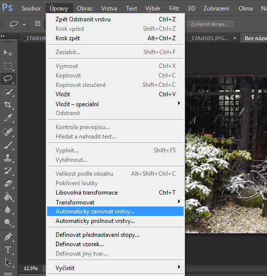 Proč tenhle neobvyklý postup? Náprava chyby. Při snímání jsme aparátem trochu pohnuli, je to nevyhnutelné. V roletovém menu Úpravy zvolíme Automaticky zarovnat vrstvy. Musíme ale mít všechny vrstvy aktivní, jinak je tento příkaz neaktivní, text je světle šedý. Tímto příkazem počítač vrstvy na sebe napasuje tím vyruší nepřesnosti vzniklé tím, že jsme během série foťákem trochu hnuli.