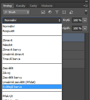 Jako režim prolnutí volíme Světlejší barva. Znamená to, že se do sebe prolnou jen ty pixely HORNÍ vrstvy, které jsou světlejší než pixely vrstvy POD ní.