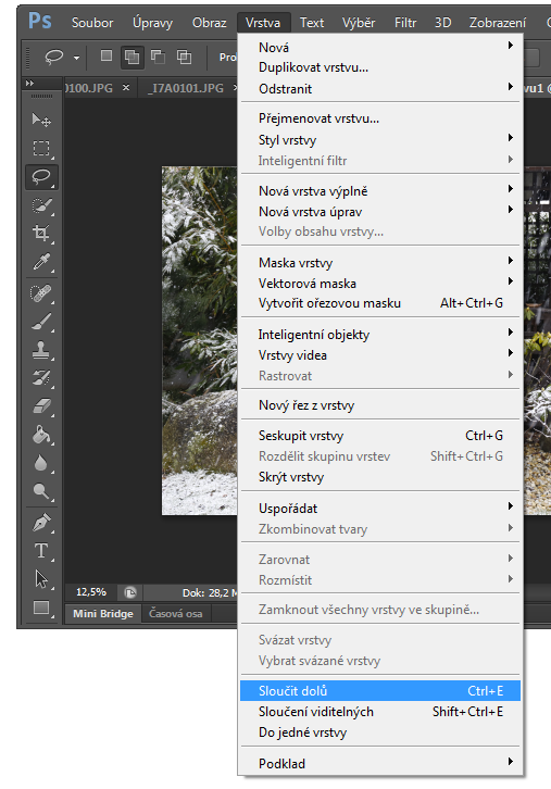 Budete překvapeni, jak vločky okamžitě zhoustly! Nezbývá než tyto dvě prolnuté vrstvy sloučit do jedné. Můžeme to dělat přes roletové menu, ale lépe je si pamatovat defaultní zkratku CTRL+E.