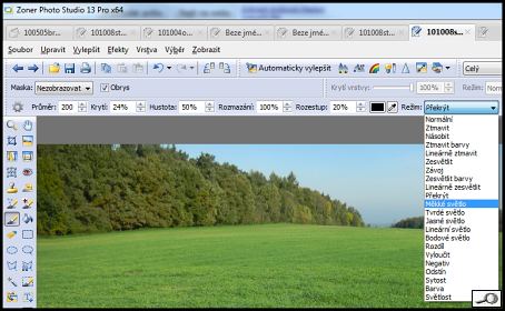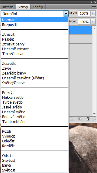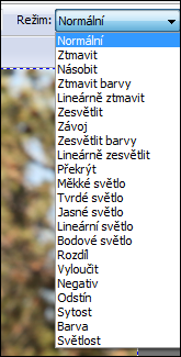 Prolínání vrstev je editační zásah velmi dobře známý všem uživatelům Photoshopu kterékoli verzze (vyjma těch historických, poznámka pro puntičkáře 🙂 ), také Paint Shop Pro a do určité míry i Zoner Photo Studia novějších verzí. Jde o to, že v režimu “normál” na sobě vrstvy jen tak leží, ale v jiných režimech je možné způsobit jejich vzájemnou spolupráci. Nabídky vypadají takto, vlevo PS, vpravo Zoner: