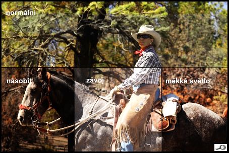 Horní část obrázku je původní, vlevo dole je následek režimu násobit, uprostřed je závoj a vpravo měkké světlo.