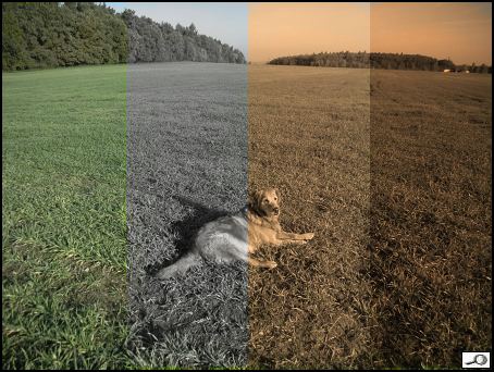 Další režimy prolnutí nevedou k výsledkům výrazně užitečným pro úpravu fotografie, s výjimkou jednoho, to je barva. Jakmile použijete režim barva na menší procento krytí, zde vlevo na 50%, dojde při použití černé barvy ke značnému útlumu barevnosti, při 100% získáme černobílý obrázek. No a pak je možné si namíchat například nám vyhovující odstín sépie: třetí proužek je pouze barva, poslední proužek byl změněn na sépii prolnutím barva a pak ještě jednou pojednán 50% černou prolnutím měkké světlo.