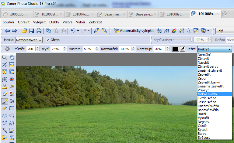 Zde jsou výsledky nejzajímavější. V režimu překrýt došlo ke zřetelnému ztmavení, avšak v režimu měkké světlo došlo ke skutečně příjemnému zpracování tónů i barev. V dalších dvou režimech obraz výrazně ztmavl, ale pokaždé stejně a vcelku nezajímavě. Režim měkké světlo tedy vychází pro tyto účely nejlépe.
