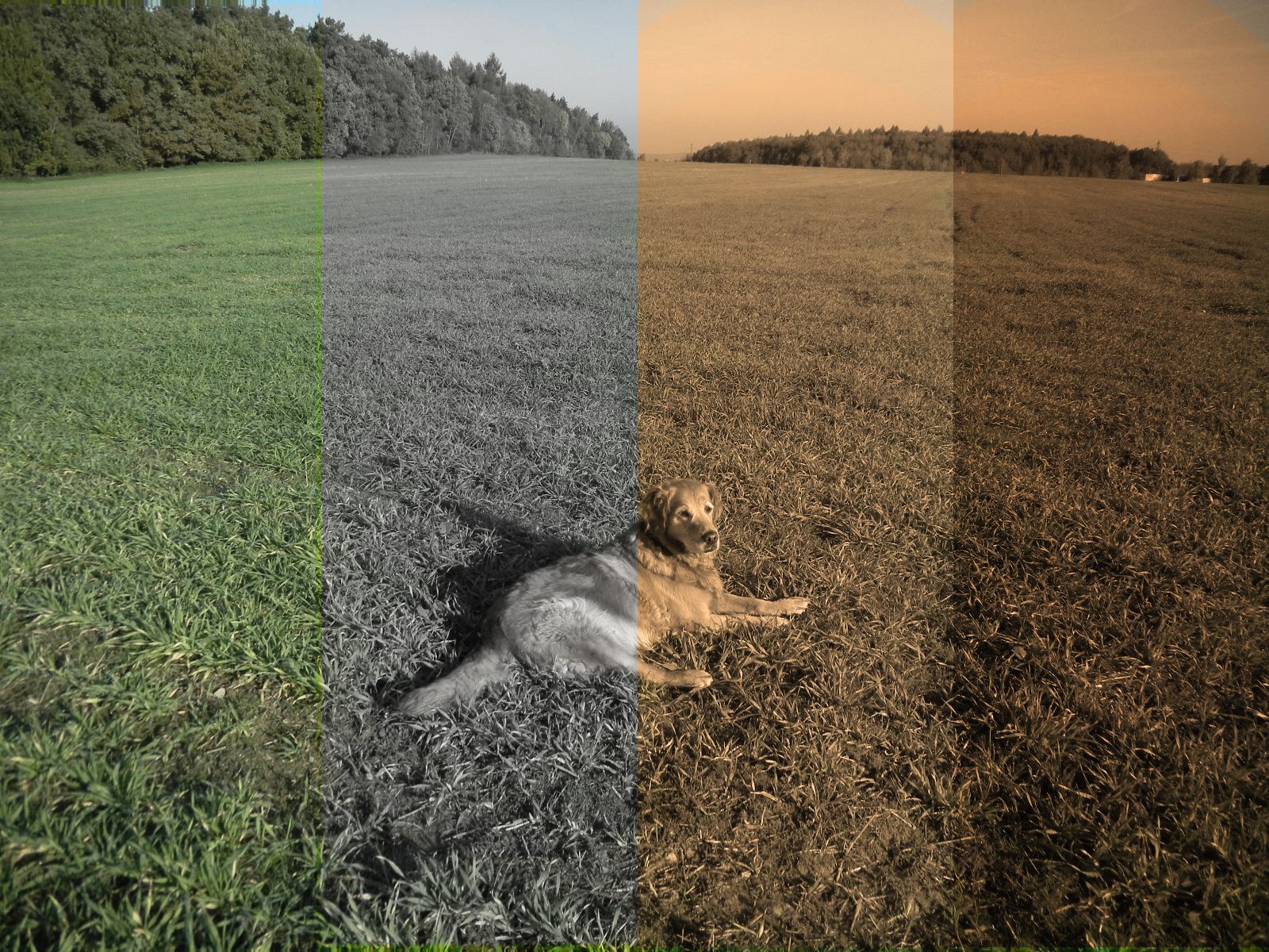 Takto si můžeme namíchat filtr na oblohu, zajímavé výsledky mi podal například filtr R 43, G 85 a B 65 při 40% krytí. Dobrá, ale jsou ještě další metody prolnutí! Uděláme zase čtyři pruhy na sousedovic Betynce a vyzkoušíme režimy překrýt (overlay), měkké světlo, tvrdé světlo a jasné světlo. Nastavil jsme krytí na 50%. Výsledek je tento:
