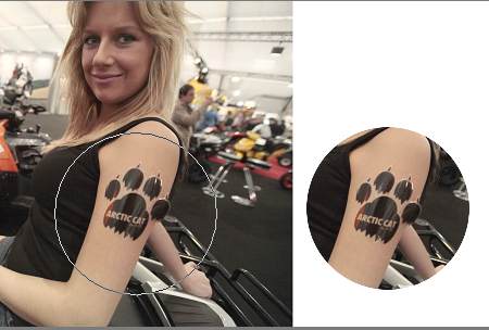 Dále, dejme tomu, bych chtěl té milé slečně odstranit nálepku z paže. To je úkol pro razítko jako dělaný. Nástroj najdete v Zoneru Photo Studiu v liště nástrojů vlevo, v Photoshopu i v PS Elements vypadá jeho ikona velmi podobvbně (a zachází se s ním také prakticky stejně).