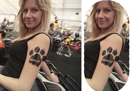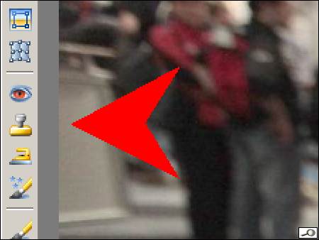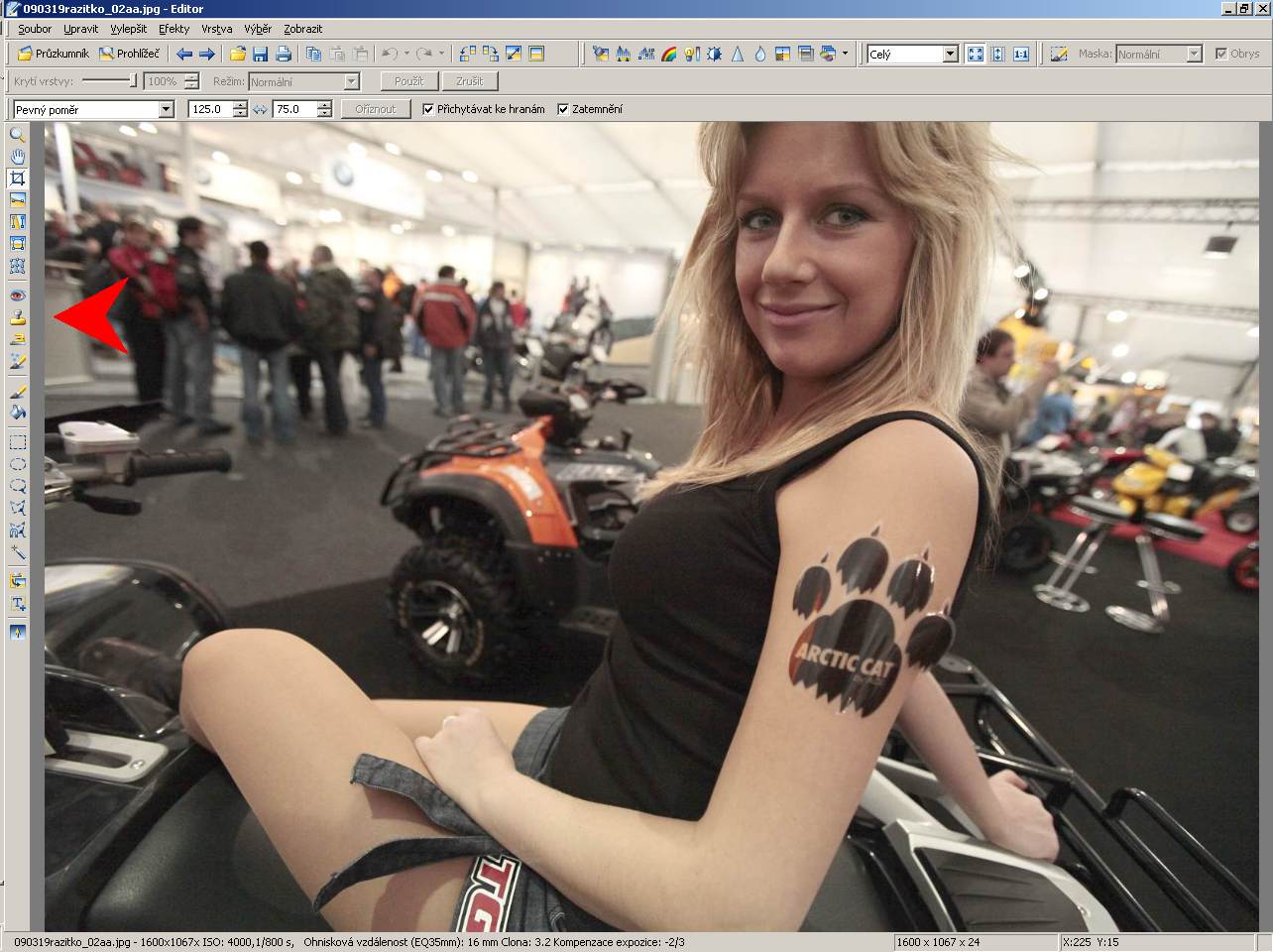 Dále, dejme tomu, bych chtěl té milé slečně odstranit nálepku z paže. To je úkol pro razítko jako dělaný. Nástroj najdete v Zoneru Photo Studiu v liště nástrojů vlevo, v Photoshopu i v PS Elements vypadá jeho ikona velmi podobvbně (a zachází se s ním také prakticky stejně).