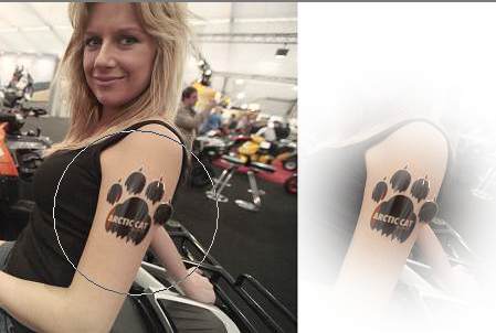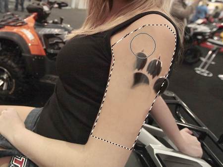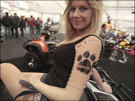 Teď budeme slečně odmarávat nálepku. Velmi si ulehčíme práci, když celou paži dáme do výběru. Jinak hrozí nebezpečí, že myší zajedeme do trika a komplikovali bychom si tím život. Takže jeď už na slečnu jdeme naostro: nejdříve výběr, pak razítko: