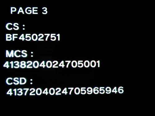 C nevíme, stejně jako nevíme V a L, kdežto písmeno U označuje použití ultrasonického filtru (což je prakticky počet zapnutí přístroje) a B je počet použití stabilizace. Stránka 3 označuje sériová čísla kamery, procesoru a datum výroby, za zkratkou CSD je dlouhá řada čísel, podstatné je to 204, to znamená, že přístroj byl vyroben v dubnu 2012.
