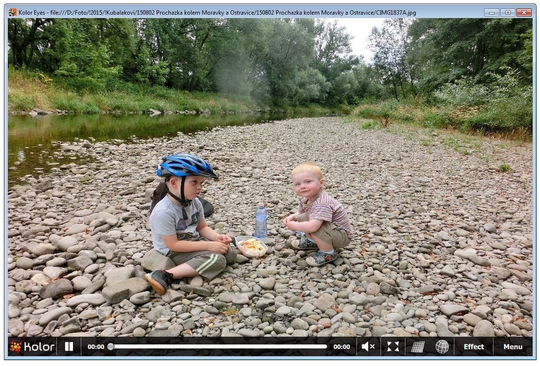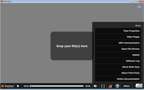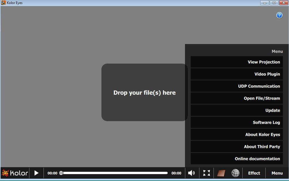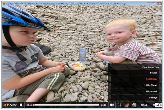 Nejprve si musíme stáhnout freewarový program Kolor Eyes 1.2, který primárně slouží jako přehrávač panoramatických (360°) videí, například zde nebo zde. Tento program totiž pracuje nejen s videi panoramatickými i obyčejnými, ale umí otevírat i fotografie v běžném formátu JPG. Zde je výchozí menu: