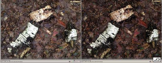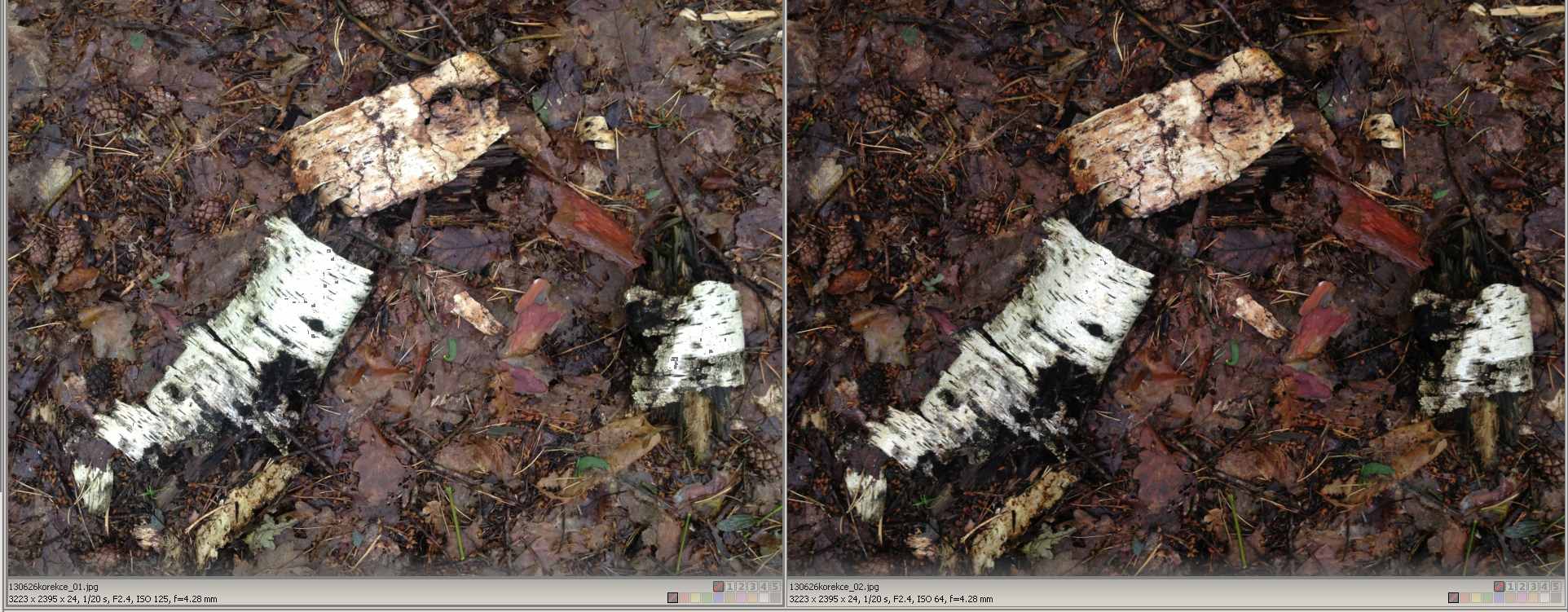 Na druhé ukázce, na té tmavší, jsem klepl na místo vyznačené čtverečkem, na bílou kůru. A rozdíl v expozici je 1EV!