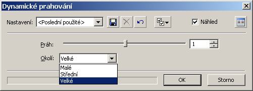Pak už aplikujeme onen filtr způsobem už uvedeným tedy upravit->efekty->dynamické prahování. Dialog vypadá takto – zde je zobrazen bez náhledu, lze zapnout náhled (vpravo nahoře) a pak v reálném čase vidíme, “co to dělá”.