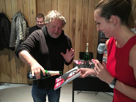 Tondu s flaškou sektu jsem zachytil já iPhonem, knihu drží Kateřina Vaňková z Albatrosu, vzadu se tetelí Roman Bureš, redaktor knihy. Grafik Jirka Koudelka je mimo obraz, leč přitomen v sále, stejně jako Štěpánka Podrazilová. To byla ona, kdo mi k narozeninám dal oranžové vodníkovské boty a na ně napsal fixkou permanentkou maximy, které vtloukám v Dílně do hlav posluchačům: málo nad hlavou, hledejte markant, stavte na liniích, tvarech a strukturách. No a jak to Štěpa tak pěkně napsala na ty boty, já na to koukal a říkal jsem si – kdo by si ty boty přečet a řídil se jimi, slušně by fotil. Těch zásad není víc než deset. Kdyby si je někdo osvojil, fotil by o mnoho líp než před tím. Takže jsem ty boty opsal a vznikla z toho kniha, kterou Kratochvíl právě křtí. Kniha o deseti krocích k lepší fotce, snadno pochopitelných a osvojitelných.