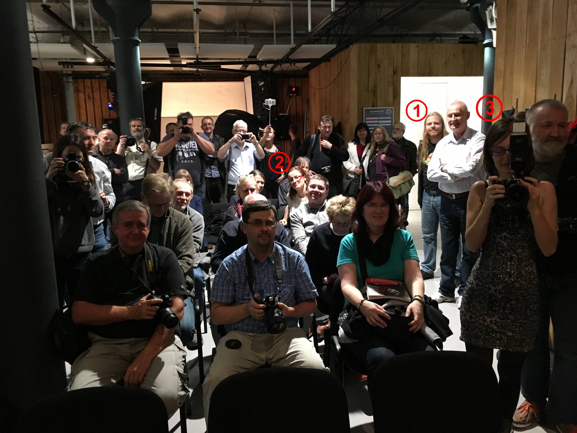 Pohled do sálu. Když si prokliknete větší fotku, pod číslem 1 shlédnete Jirku Koudelku, 2 je Štěpánka Podrazilová a pod č. 3 se skrývá Martina Houdek.