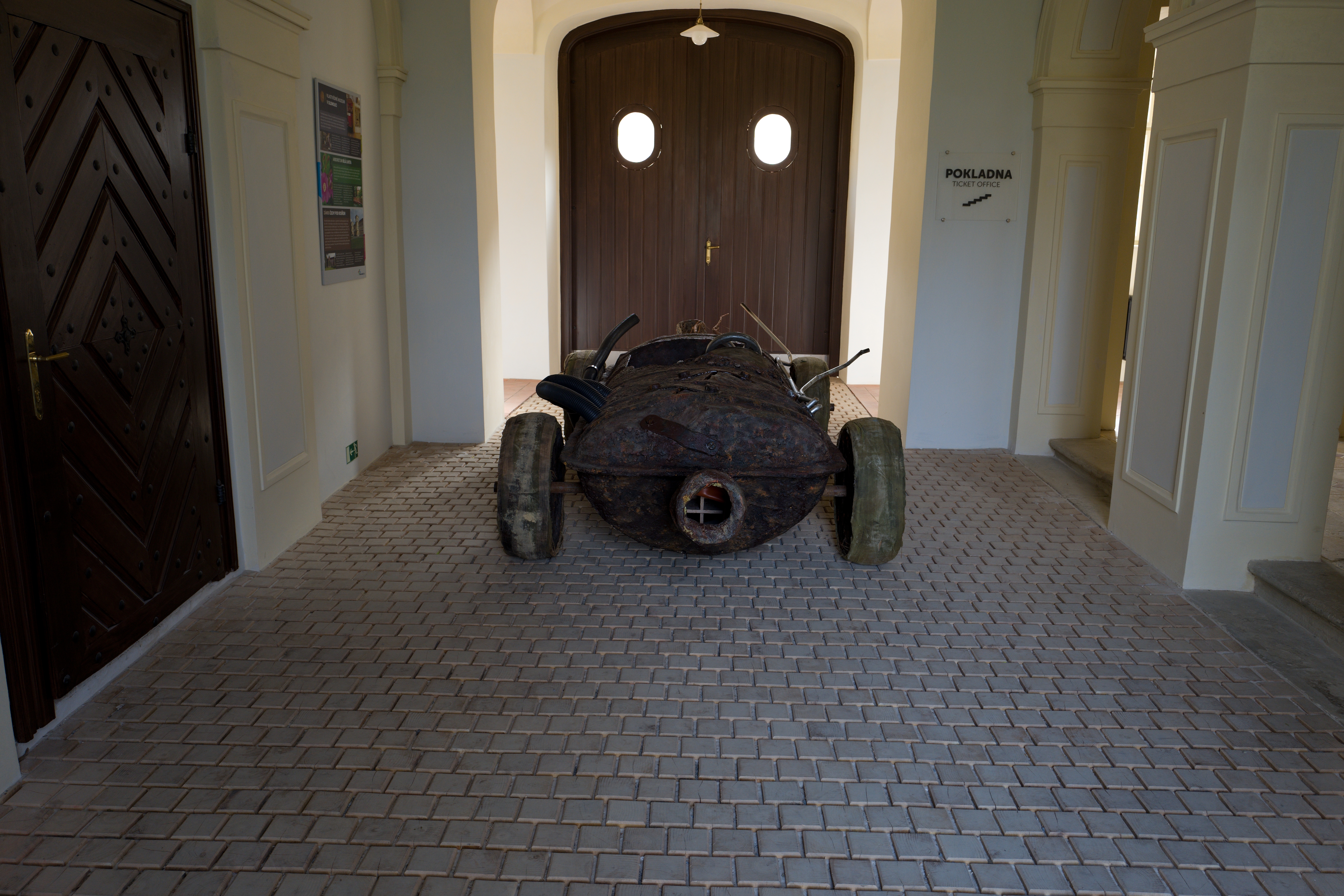 Snímek chodby svědčí o dynamickém rozsahu. Dveře vlevo vykazují slité stíny, ale přepaly jsou jen v kulatých okénkách. Snímek byl pořízen s korekcí -0.60 EV,
