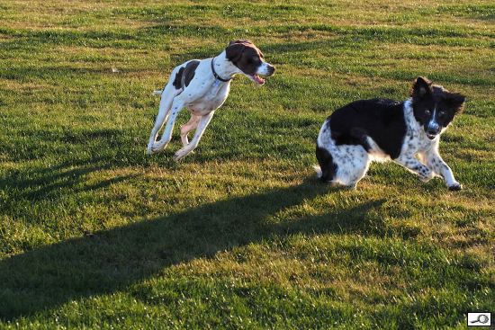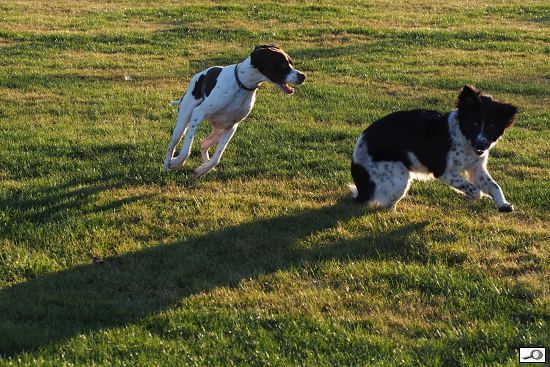 No a výsledná fotka si zachovala podvečerní atmosféru, ale pejskové jsou lépe vidět. A o to šlo.