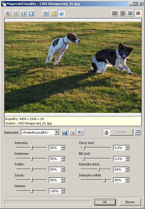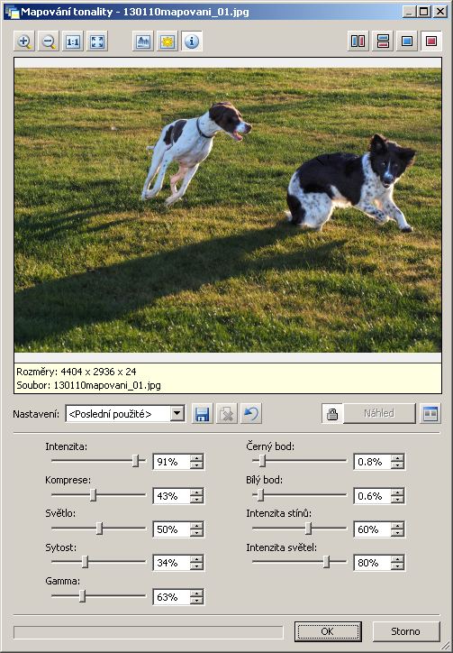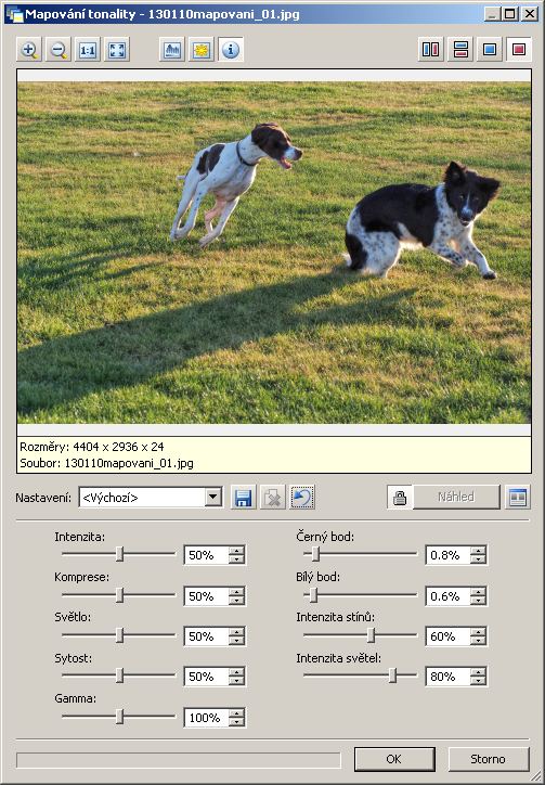 Zkusme nejdřív aplikovat mapování tonality na celý obrázek. Ukázka zachycuje výchozí nastavení, to lze rozsáhle měnit a věřte mi, že jsem zkusil doslova psí kusy, ale vždycky na to doplatila ta pěkná podvečerní atmosféra záběru v protisvětle zapadajícího slunce.