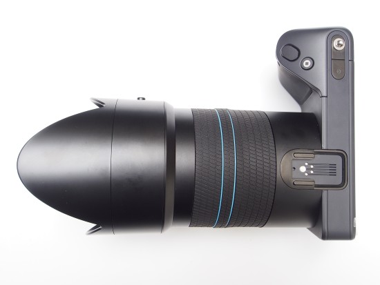 Hořčíkové a hliníkové tělo váží 940 g, přičemž rozměry jsou 86mm x 145mm x 166mm . Pocitově máte dojem, že je ten aparát nepatřičně lehký, něco jako maketa na výstavu. Ale funguje. Na obrázku pořízeném shora vidíte na gripu spoušť a u něho je kulaté tlačítko – Lytro tlačítko. To se používá k nastavení zaostřovací vzdálenosti. Nejde totiž o to, že „to ostří samo“, ale o to, že při zpracování v editoru se dají vygenerovat dílčí fotky s různou rovinou zaostření, připadaně lze vygenerovat video, kde vidíte přechody ostření.