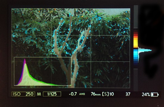 Displej je výklopný a dotykový. Režimy jsou manuální a priorita času, což je samozřejmě matoucí, protože se clona tady v podstatě neprojevuje a expozici ladíme nastavením ISO a času. Podstatná je ta duha vpravo: to jsou pásma ostrosti, žluté a červené označují pozadí a modré popředí. Ta modrá čepička vpravo se musí otáčením ostřicího prstence nastavit doprostřed.