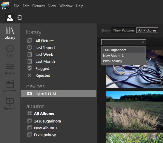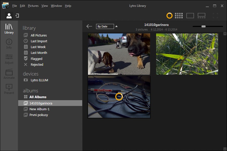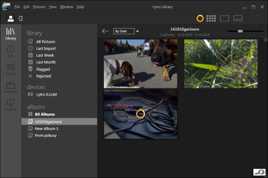 To je dějství druhé. Je třeba mít komunikační software Lytro Desktop, aktuální verze je 4.0.3. Po připojení vás LD vyzve zadat existující album nebo vytvořit nový, zvolit kterou z pořízených fotek chcete importovat a proces může začít. Žluté kolečko značí, že se na obrázku pracuje.