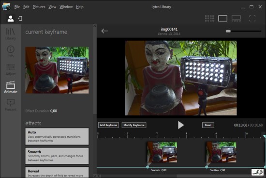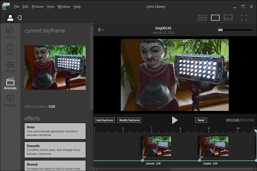 Zajímavější je varianta vyexportované video MP4. To se dá vyexportovat ze syrového živého obrázku, anebo ten se dá upravovat. Dělá se to metodou podobnou výrobě animovaného GIFu, přidáte frame a jemu přiřadíte (pokud chcete) efekt. Na ukázce vyrábím produktovku pro LED lampu Manroto 🙂 .