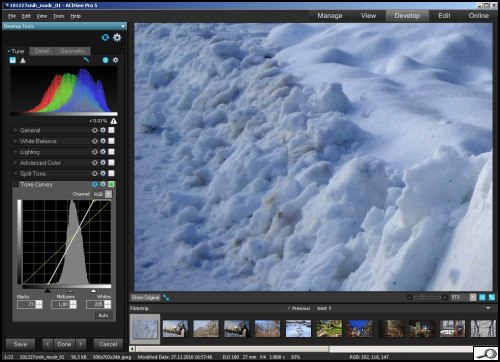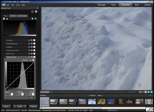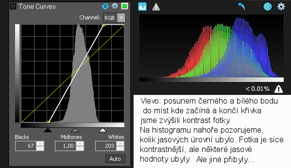 Jenže my víme, že s kontrastem se dá hodně dělat. V ADCSee Pro 5 mají sloučenou kartu Úrovně a Křivky. Je to ten spodní histogram označený Tone Curves. Na jeho spodním okraji vidíme tři jezdce, černý vlevo (blacks),, šedý střední „midtones) a pravý bílý /whites). Můžeme jimi libovolně hýbat a tím budeme ovlivňovat tonalitu obrazu. Pak se nástroj bude chovat jako Úrovně. Pokud sáhneme na tu úhlopříčnou čáru, můžeme ji všelijak prohýbat a pracujeme pak s nástrojem Křivky. Lze kombinovat jedno s druhým.