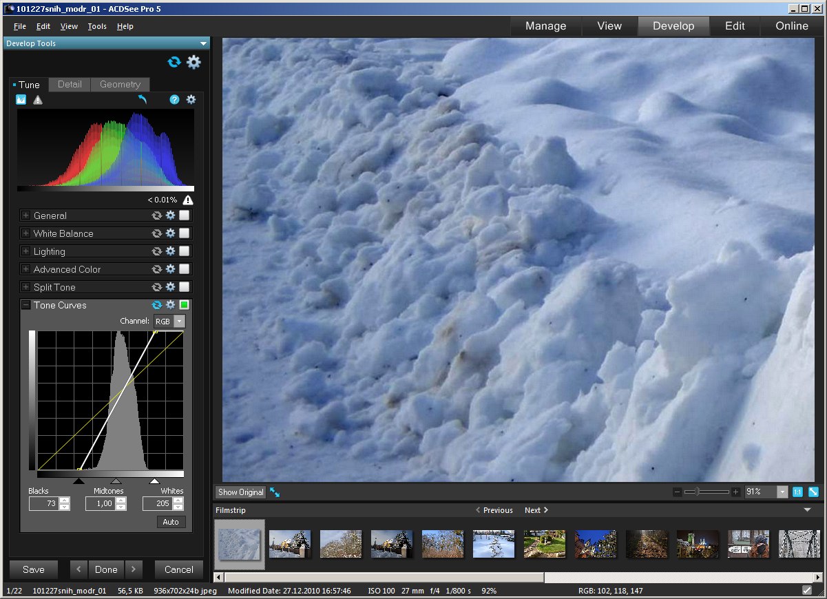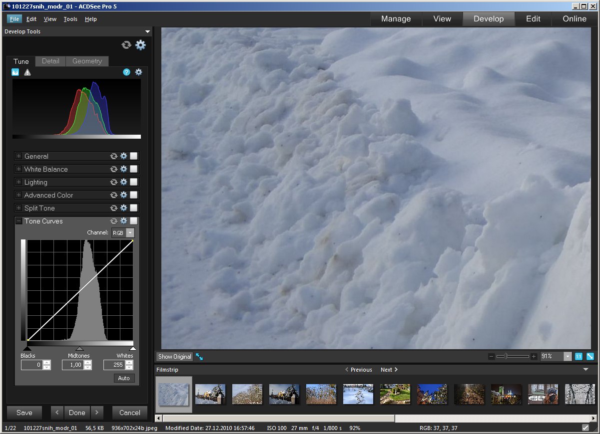 Jenže my víme, že s kontrastem se dá hodně dělat. V ADCSee Pro 5 mají sloučenou kartu Úrovně a Křivky. Je to ten spodní histogram označený Tone Curves. Na jeho spodním okraji vidíme tři jezdce, černý vlevo (blacks),, šedý střední „midtones) a pravý bílý /whites). Můžeme jimi libovolně hýbat a tím budeme ovlivňovat tonalitu obrazu. Pak se nástroj bude chovat jako Úrovně. Pokud sáhneme na tu úhlopříčnou čáru, můžeme ji všelijak prohýbat a pracujeme pak s nástrojem Křivky. Lze kombinovat jedno s druhým.