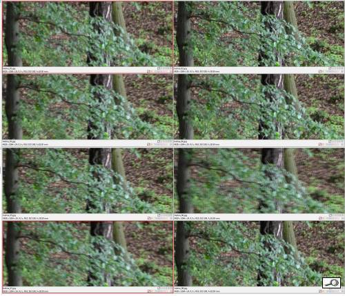Experimentoval jsem s přístrojem Nikon Coolpix A. Je to kompakt s pevným ohniskem , odpovídajícím 28 mm kinofilmového aparátu. Nemá stabilizaci. Podle zásady, že „kolik mm ohniska, tolikatina vteřiny je udržitelná“, měl bych udržet 1/30 sec a vskutku udržím bez problému. Pořídil jsem tři série, třináctinou, desetinou a třetinou vteřiny z ruky bez opory, sériovým focením. Na první ukázce je série snímků pořízená třináctinou, tedy zhruba 1EV přes mez stanovenou zásadou kolik mm, tolikatina vteřiny. Výsledky jsou celkem vyrovnané, nejlepší je fotka č. 3 a 4, nicméně žádná není katastrofálně hnutá – podotýkám, že jde o výřezy 100%.