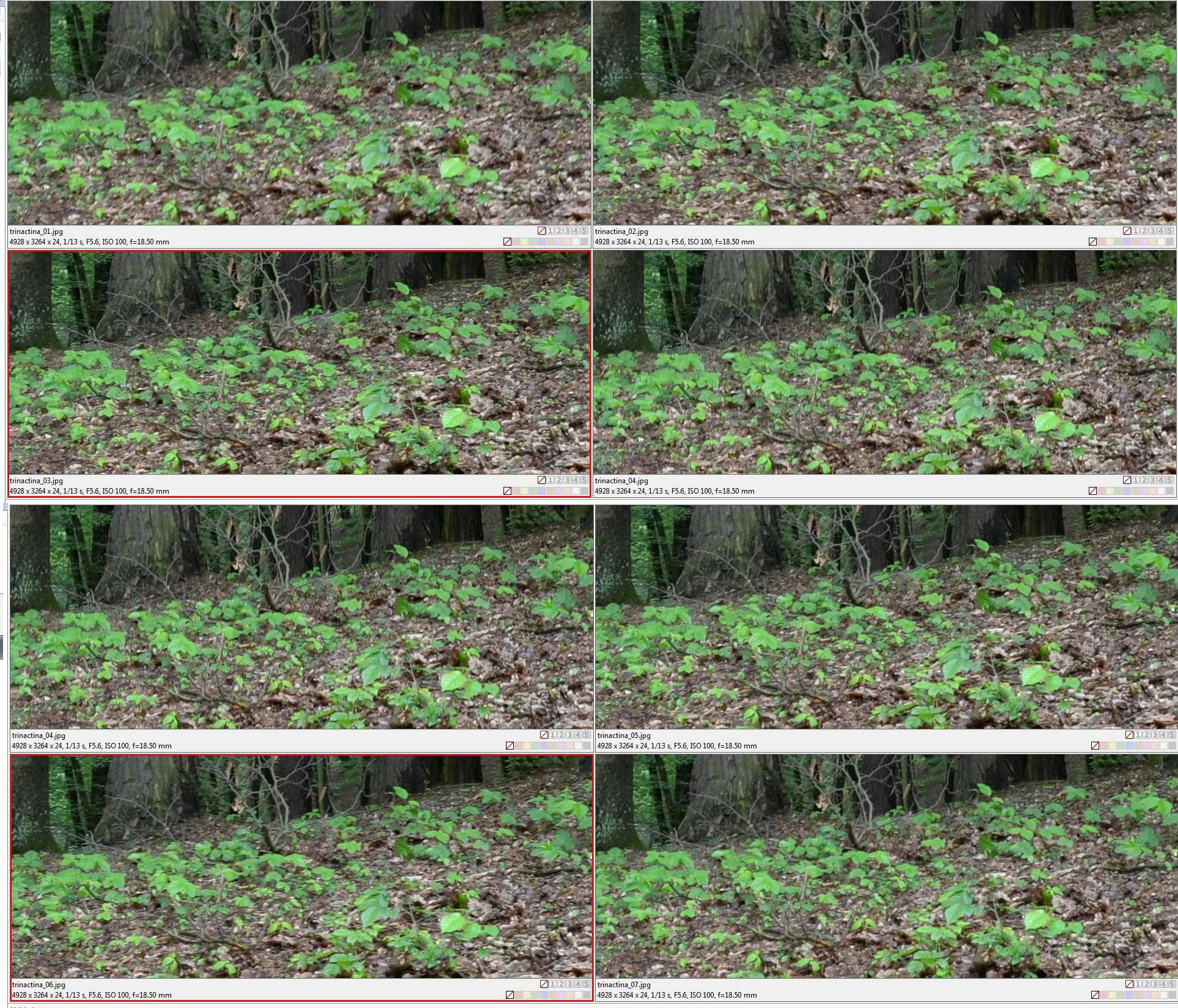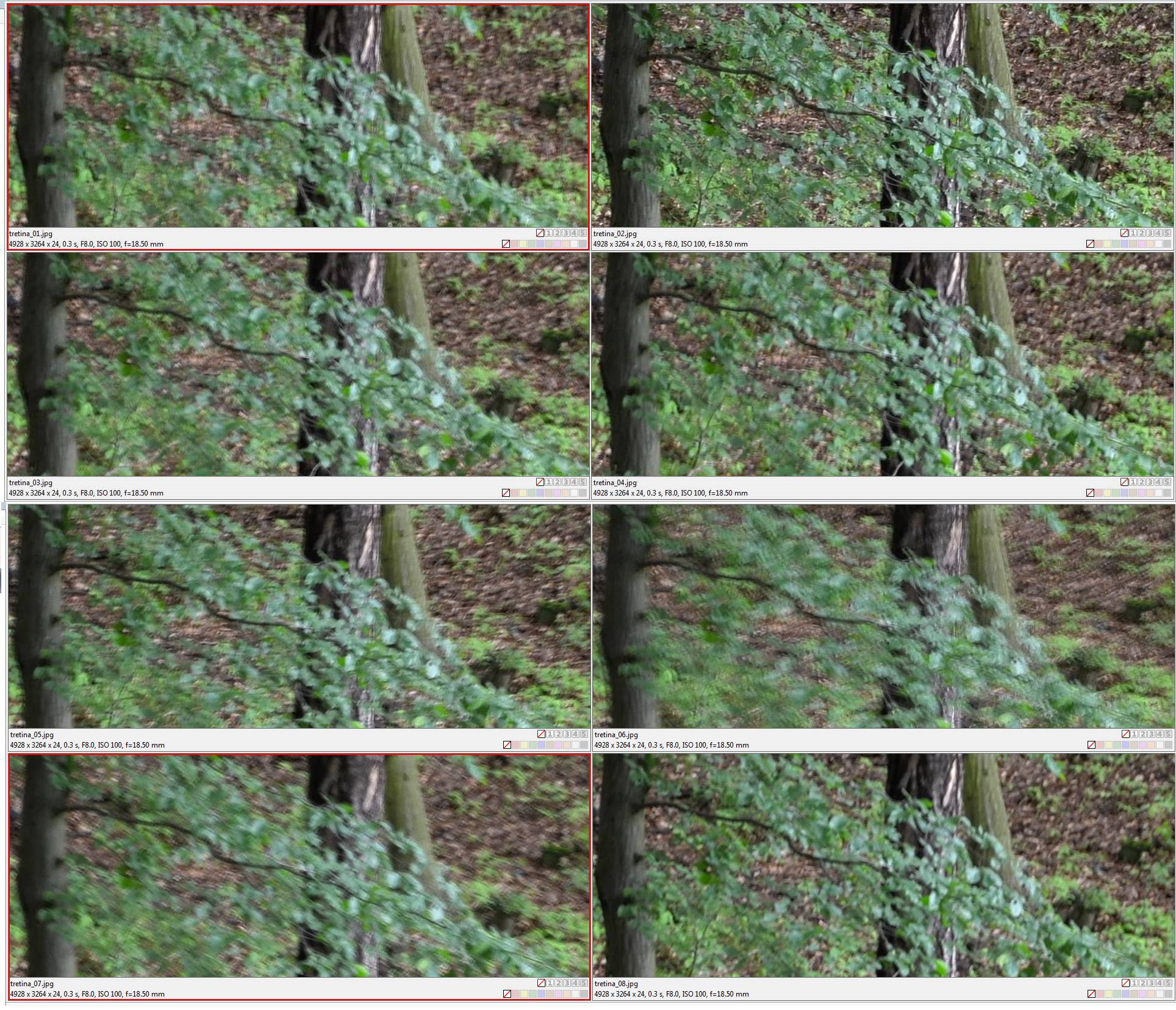 Experimentoval jsem s přístrojem Nikon Coolpix A. Je to kompakt s pevným ohniskem , odpovídajícím 28 mm kinofilmového aparátu. Nemá stabilizaci. Podle zásady, že „kolik mm ohniska, tolikatina vteřiny je udržitelná“, měl bych udržet 1/30 sec a vskutku udržím bez problému. Pořídil jsem tři série, třináctinou, desetinou a třetinou vteřiny z ruky bez opory, sériovým focením. Na první ukázce je série snímků pořízená třináctinou, tedy zhruba 1EV přes mez stanovenou zásadou kolik mm, tolikatina vteřiny. Výsledky jsou celkem vyrovnané, nejlepší je fotka č. 3 a 4, nicméně žádná není katastrofálně hnutá – podotýkám, že jde o výřezy 100%.