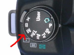 Šipka ukazuje na označení manuální expozice na kruhovém voliči zrcadlovky Samsung GX10.