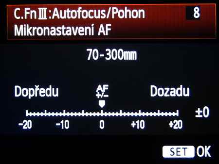 Opatrně prohlásím, že si nemyslím, že je mikrokalibrace k ničemu, rozhodně je dobře mít nějaké to štelováníčko k disposici. Nicméně mám asi právo po provedených pokusech prohlásit, že necítím vášnivou potřebu nastavovat svůj přístroj na zmíněný Tamron, a ke stejnému výsledku, tedy k nulovému rozdílu, jsem došel s objektivem Canon 70-200/2.8.