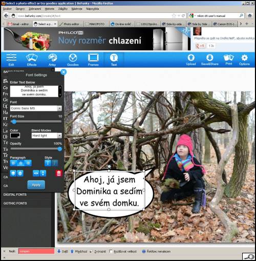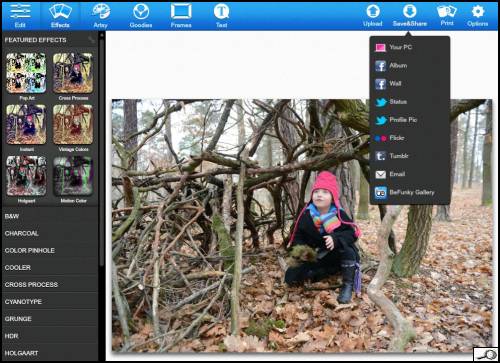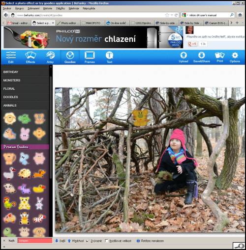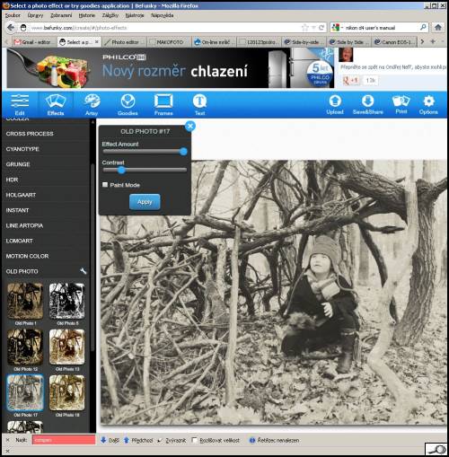 V lednu jsem tu přiblížil on line editor Autodesku nazvaný Pixlr. Náš čtenář pan M. V. Byl tak laskav a upozornil mě na další zajímavý program, taktéž na webu, nazvaný Befunky. Určitě stojí za vyzkoušení! Týrat budeme fotku nevinného dítěte, mé vnučky Dominiky. V první fázi fotku nahrajeme, jak vidno, lze to z disku, ale i z dalších webových zdrojů. Já to udělal z PC.