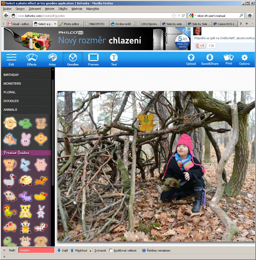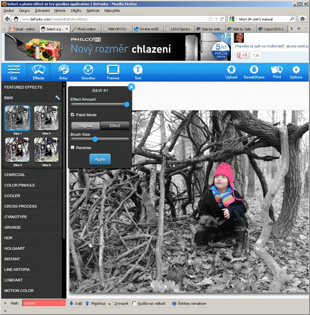 V lednu jsem tu přiblížil on line editor Autodesku nazvaný Pixlr. Náš čtenář pan M. V. Byl tak laskav a upozornil mě na další zajímavý program, taktéž na webu, nazvaný Befunky. Určitě stojí za vyzkoušení! Týrat budeme fotku nevinného dítěte, mé vnučky Dominiky. V první fázi fotku nahrajeme, jak vidno, lze to z disku, ale i z dalších webových zdrojů. Já to udělal z PC.