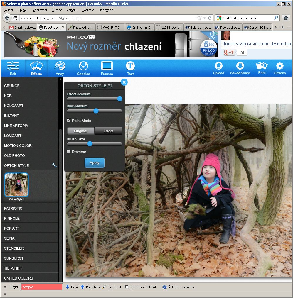 Filtrů je mnoho, doporučím ještě Orton style, už jsme se tím tady v Digineffu taky zabývali – je to aplikace jakési mlhy do fotky. Opět jsme přešel do Paint mode, kdy mohu vymaskovat do, co nechci zamlžit. Bohužel nelze měnit sílu aplikace štětce, jede pořád na 100%.