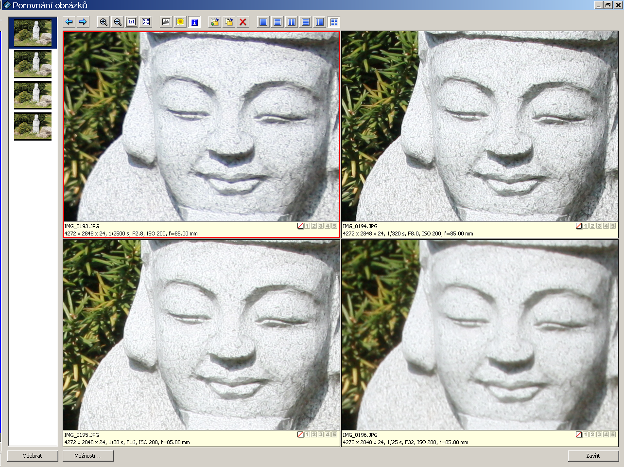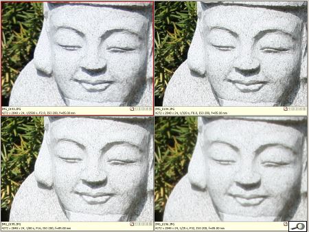Vysoká clona (vysoké clonové číslo, malý clonový otvor) líp kreslí. To se tvrdí a mnoho lidí se tím tvrzením řídí. Je to ale pravda? Pojďme se na to podívat blíže. A podívat se blíže znamená si to vyzkoušet. Pořídil jsem tedy sérii obrázků Canonem EOS 450D a objektivem Canon 70-200 mm 1:2.8 L, s clonami F2.8, F8.0, F16 a F32. Výsledek vidíme na této ukázce: