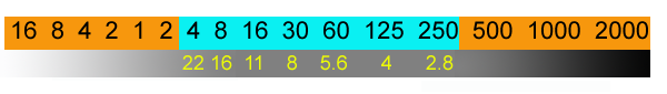 Vidíme, že clonová řada je podstatně kratší, je omezenější než časová. Je jen omezené množství kombinací clony a času za daného osvětlení. V našem konkrétním případě je to 1/4 sec a F22, 1/8 sec a F16. 1/16 sec a F8 a tak dále, až 1/250 sec až F2.8. Kterákoli z těchto kombinací vede ke správné expozici za dané úrovně osvětlení a dané citlivosti v ISO. Pásmo “správných” časů je vyznačeno modře, nesprávných oranžově. Vlevo máme přeexpozici, vpravo podexpozici. Když tedy zvolíme za daných podmínek 1/500 sec, přístroj nastaví clonu F2.8, ale dál už nemůže – objektiv zde končí, menší clonu nemá. Výsledkem tedy bude podexpozice. Ještě výraznější by byla podexpozice při 1/1000 sec nebo dokonce při 1/2000 sec.