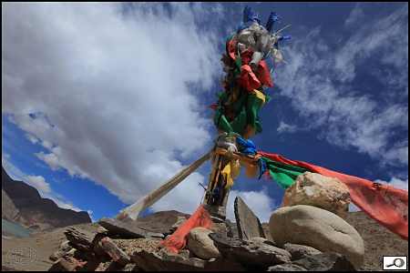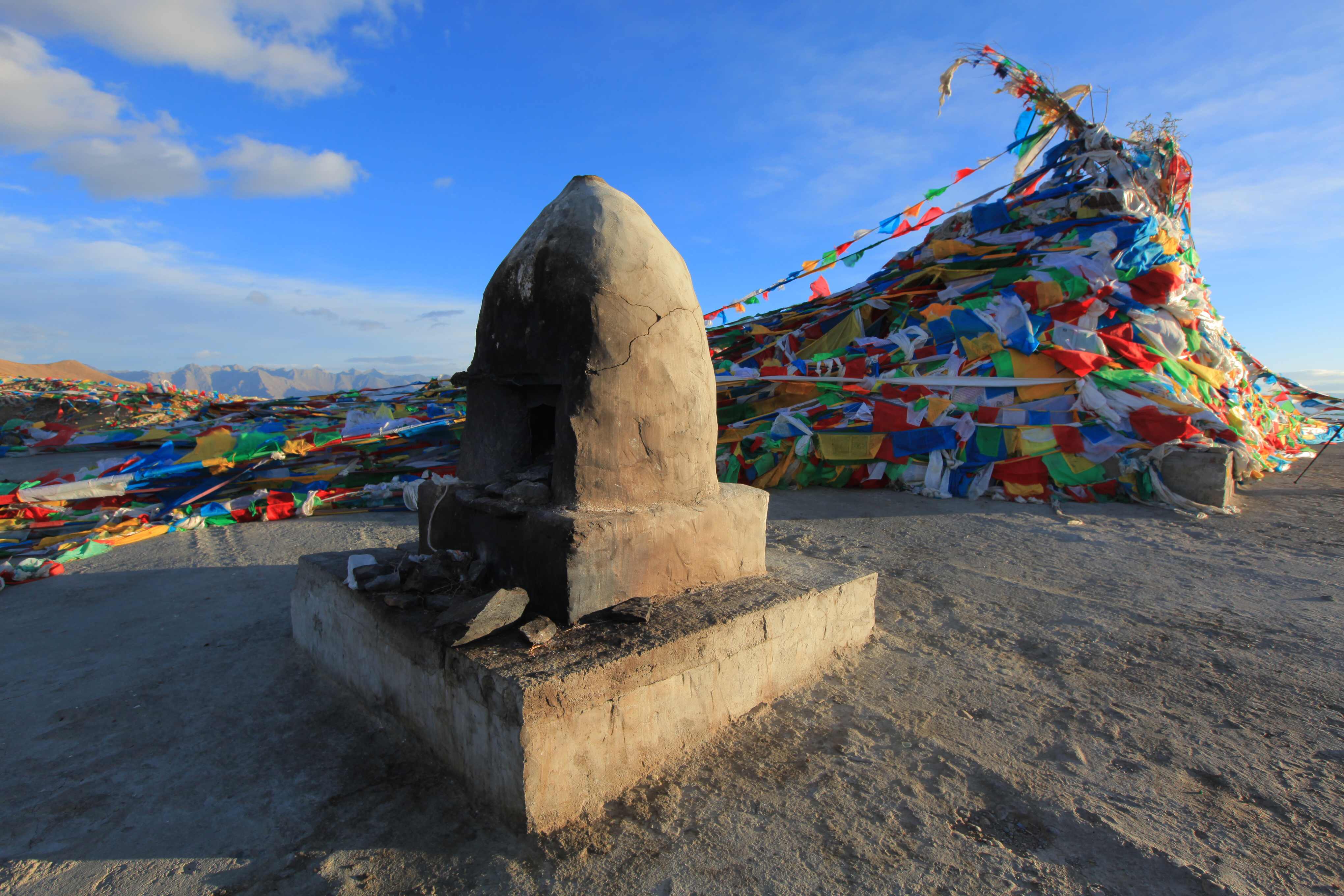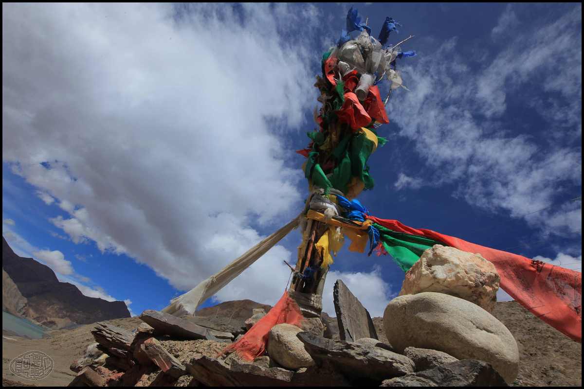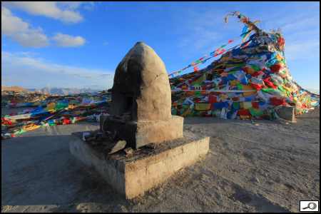 Ten pravý východ slunce nás ale zastihl na jednom z posvátných míst nad posvátným jezerem… ano, smiřme se s faktem, že všechno je tu nějak posvátné. To co vypadá jako hromada haraburdí jsou vlaječky s modlitbami. Pověsíte modlitbu a vítr se modlí za vás.